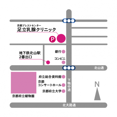 アクセス 医療法人財団今井会 足立病院 京都ブレストセンター足立乳腺クリニック 〒603-8052 京都市北区上賀茂松本町98 (下鴨中通北山上ル一筋目北西角) 075-723-0811 075-723-0816 電話受付時間 月~金8:30~17:00 / 土8:30~12:00 地下鉄北山駅2番出口から北へ徒歩2分 市バス4号・北8号系統北山駅前下車徒歩1分 駐車場有