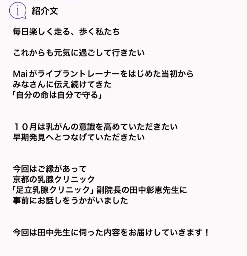 ピンクリボンセッション無料視聴のご案内 10月14日(月・祝日)19:50~ 当院の田中彰恵副院長によるピンクリボンセッションが行われます。 視聴方法はライブランというランニングアプリをダウンロードして頂きましたら、今回の視聴はどなたでも無料でご視聴頂けます。 こちらのアプリではセッションにご参加頂くとラジオの様にMCがランニングの順位や参加者のコメントを読み上げつつ、トピックのお話をしてくれるアプリです。 田中彰恵副院長は趣味のランニングの際、こちらのアプリを聴きながらランニングされています。 (基本的には有料アプリではございますが、今回の視聴は無料となっております。) ご興味お持ちの方、ぜひご視聴下さいませ。