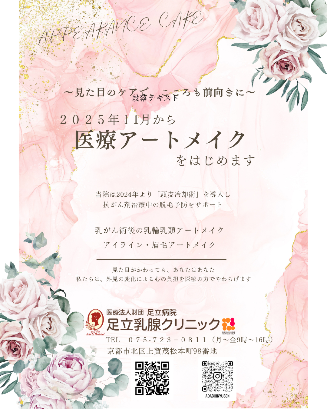 がん医療アートメイク始めます~ がん医療アートメイク あなたらしさを、そっと守る 医療機関だからできる安心の医療アートメイク がん医療アートメイクが11月から毎週金曜日スタートします! 形成外科医の診察を受けた後に、専門のアートメイク看護師が施術を行いますので、安心してご利用いただけます。 詳しい情報やご予約については、 お気軽にお問い合わせください TEL 075-723-0811 *がん医療アートメイク施術の対象は 今までにがんと診断された方になります。