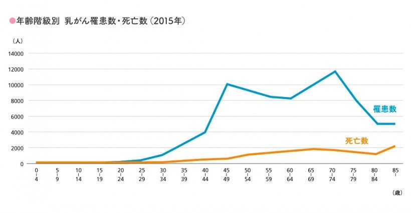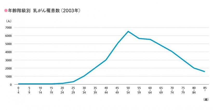 乳がんについて 日本人の乳がんの状況 日本では乳がんが年々増加し、女性が罹患するがんの第1位になっています。 現在、毎年約10万人の人が乳がんにかかっています。乳がんになりやすい年齢をみると、30歳代後半から増えてきて、40歳代後半と70歳前後にピークがあり、2000年前半と比べると高齢者での発症が増える傾向がみられます。